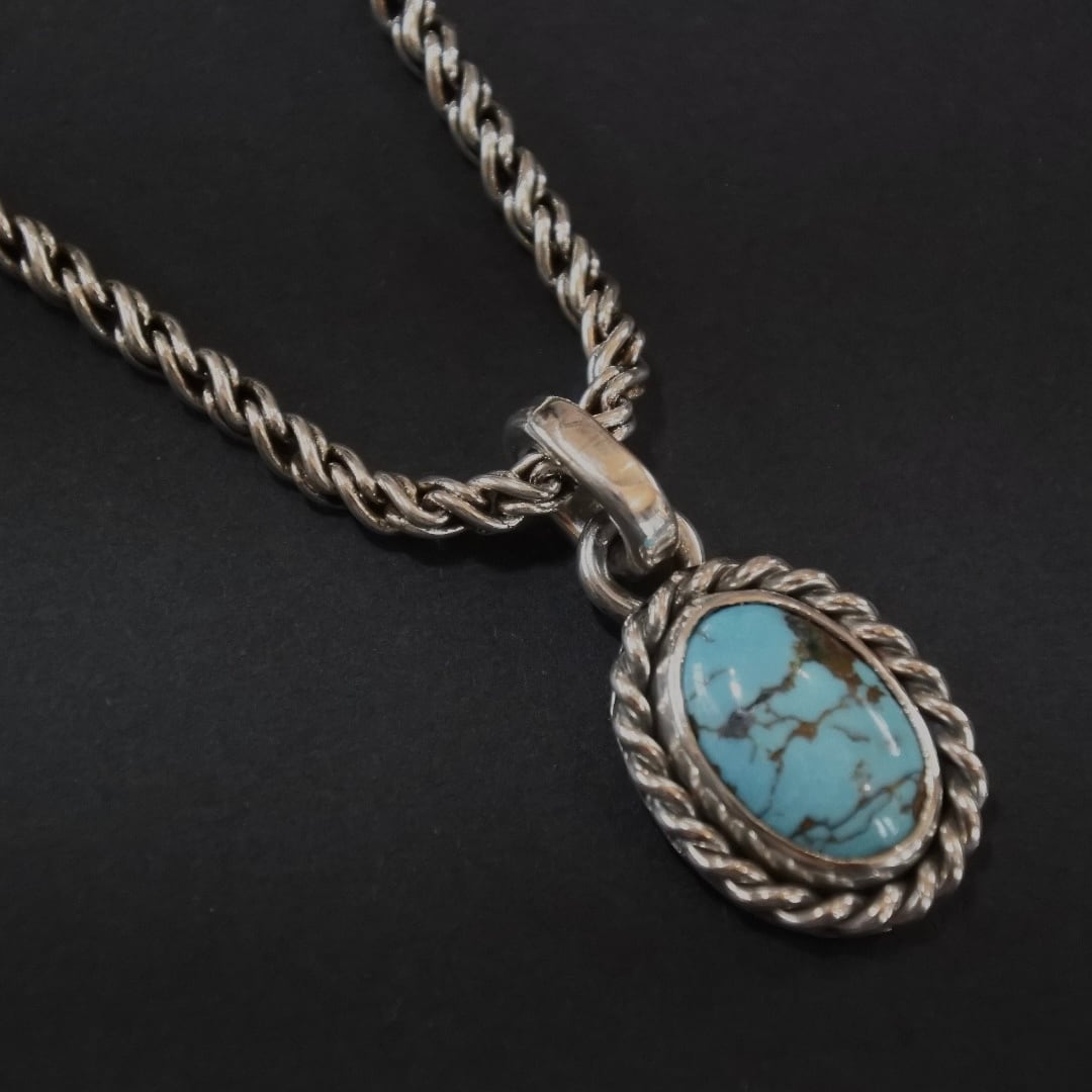 石を囲むツイストフレームもネイティブジュエリーで定番とされていて、シンプルで力強く、ターコイズそのものの存在感を引き立てます。
